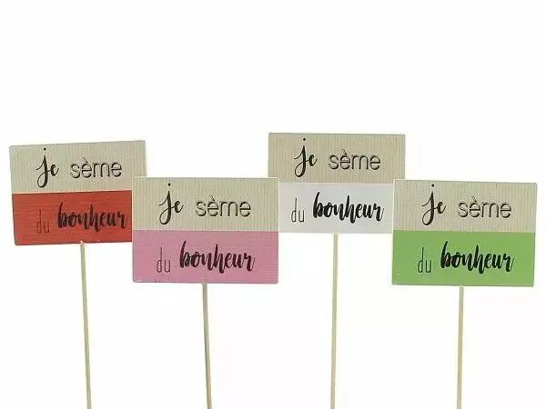 Accueil > Évènements du moment > 1er Mai > Décoration 1er mai > Pic Bois "Je sème le bonheur" 7,5x5,5 H21 Rose ( x 12 )