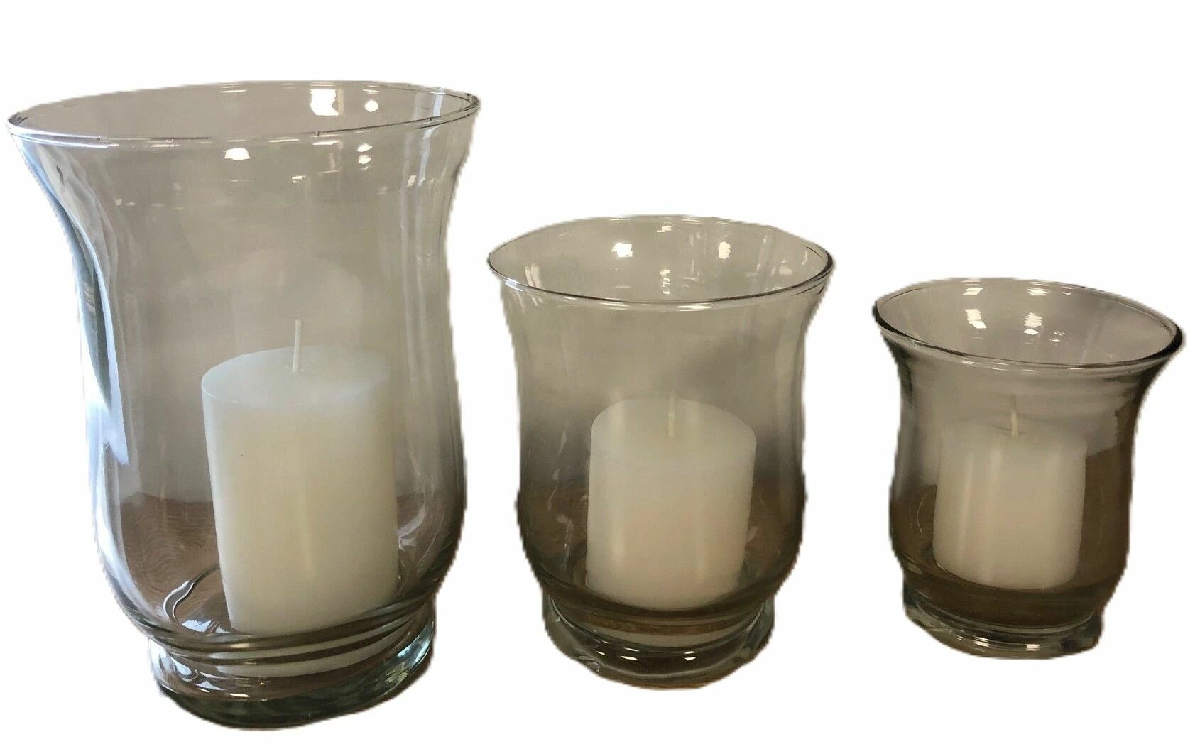 Set de 3 vases en verre transparent et de 3 bougies cylindriques.
